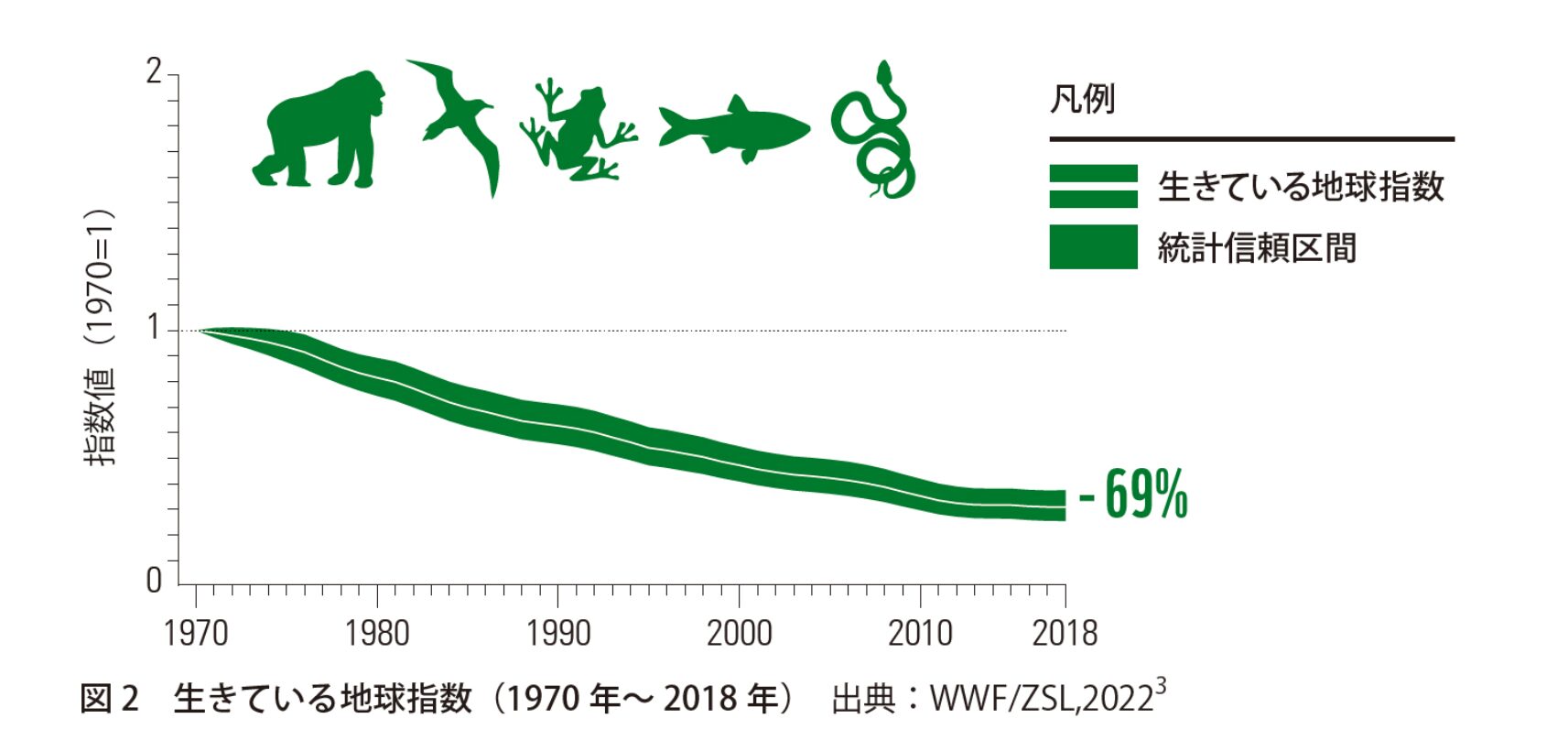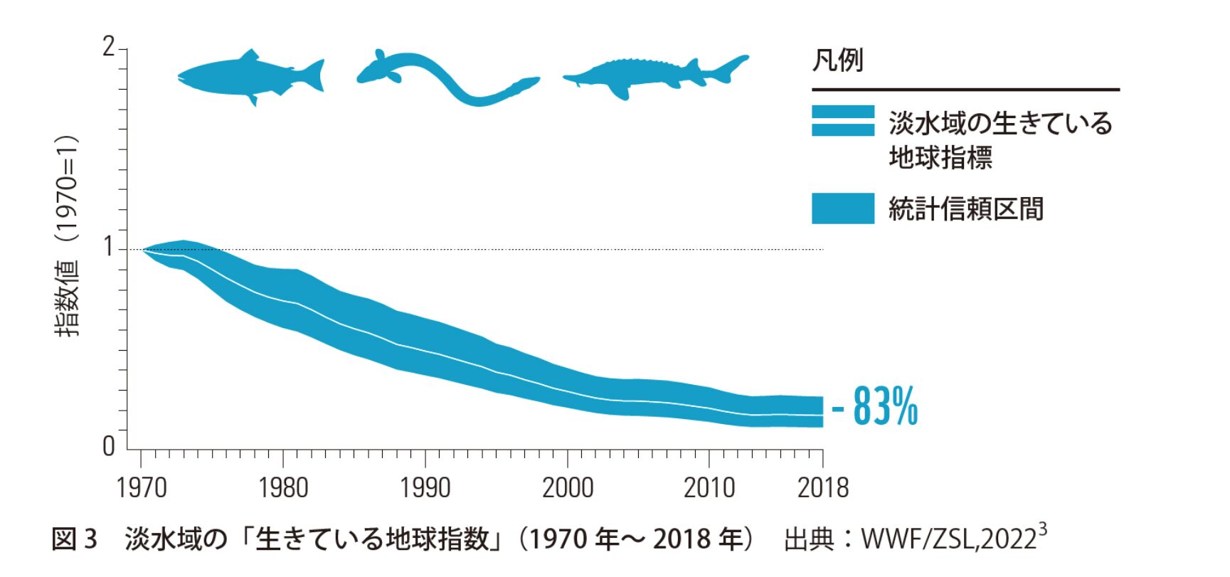 生物多様性は現在損失し続けている状況にあり、危機的な段階だといわれています。WWFは、自然と生物多様性の健全性を測る指標「生きている地球指数LPI」の結果を通して、生物多様性の減少に警鐘を鳴らしています。WWFの調査結果によると、地球全体の生きている地球指数LPIが1970年から2018年の50年間で69%も低下していることが明らかになっており、 中でも食料の生産、生活用水、産業利用など人間の社会生活に深く関係している淡水域の生物は83%減少しているという結果になり、深刻な状況が明らかになっています。