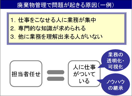 経験を積んだ担当者しか一定レベルの業務が出来ない、または経験・スキルの有無により担当者の判断に大きな差異が生じてしまう問題があります。廃棄物管理は委託基準違反等による罰則や措置命令等、法人・個人としても大きなリスクがありますので引継ぎ後の品質維持も重要なポイントとなります。