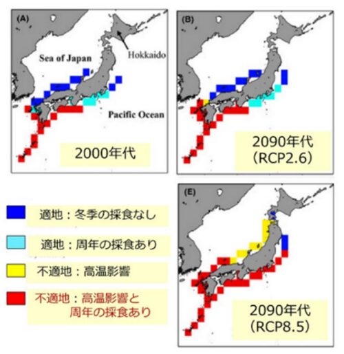 Takao, S., Kumagai, N. H., Yamano, H., Fujii, M., Yamanaka, Y.(2015)Projecting the impacts of rising seawater temperatures on the distribution of seaweeds around Japan under multiple climate change scenarios Ecology and Evolution,5, 213-223. DOI: 10.1002/ece3.1358