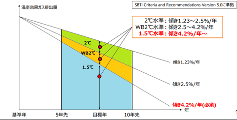 | 目標レベル | ■Scope1,2 1.5℃:少なくとも年4.2%削減 ■Scope3 算定・削減(特定の基準値はなし) | 下記水準を超える削減目標を任意に設定 ■Scope1,2 1.5℃:少なくとも年4.2%削減 ■Scope3 Well below2℃:少なくとも年2.5%削減 |
