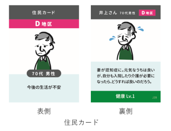 超高齢社会体験ゲーム「コミュニティコーピング」は、第4回でご紹介した「社会的処方」を用い、人と地域資源をつなげることで「社会的孤立」を解消する協力型のゲームです。プレイヤー同士が協力し、孤立する人の本当の悩みを引き出して、専門家や地域の人たちにつなげていくことで「解決」を目指すというストーリーをゲームによって体験していく内容になっています。