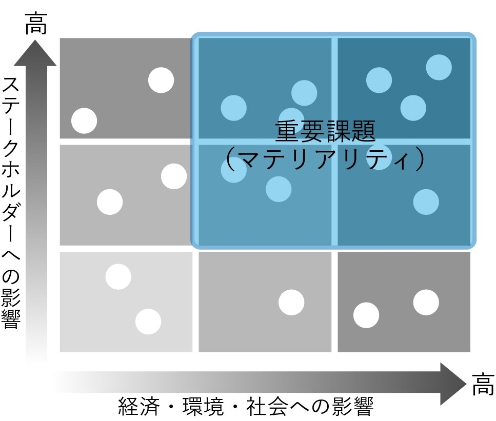 前述したシングル/ダブル・マテリアリティの議論も含め、マテリアリティに関しては複数のイニシアチブで異なる考え方が示されており、統合された一つのスタンダードと言えるものは存在しません。従来のCSRの延長として取り組まれていた時期には、国内では特に、GRIスタンダードの考え方を参考に以下のマテリアリティマトリックスなどを使用して優先度を判断する在り方が主流でしたが、現在は各企業それぞれ、いくつかある考え方を参考にしつつ、マテリアリティの評価と特定を行っています。