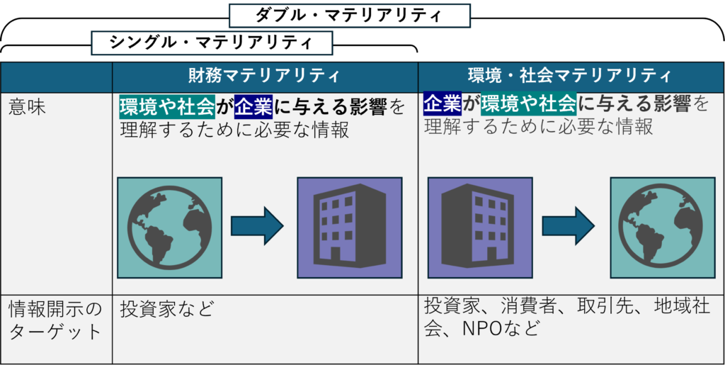 マテリアリティは目的が異なる「財務的マテリアリティ」と「環境・社会的マテリアリティ」という言葉で分類されています。「財務的マテリアリティ」はサステナビリティに関連した事項が企業の発展、業績、財政状態等へ与える影響を把握するのに必要な情報で「環境・社会的マテリアリティ」は企業活動が外部へ与える影響を理解するのに必要な情報という意味です。