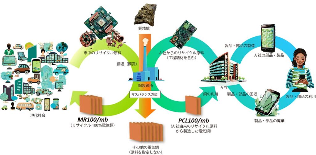 JX金属株式会社ではマスバランス方式を用いた100%リサイクル電気銅の提供を開始することを発表しています。同社はユーザーが回収した使用済み製品をはじめとしたリサイクル原料を素材とする「PCL100/mb」と、マスバランス方式を採用した「MR100/mb」の2種類のリサイクル電気銅の提供を予定しています。2024年の7月時点で第3者認証であるCoC認証についても完了しており、カーボンフットプリントの削減や、リサイクル比率の向上などに向け取り組みが進められています。