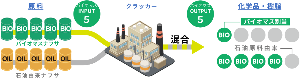 三井化学グループの株式会社プライムポリマーで提供しているバイオマスポリプロピレンの「Prasus(R)」は、バイオマスナフサと石油由来ナフサを原料とし混合を行い完成した製品の一部にバイオマスの特性を割り当てています。同社ではISCC PLUS認証も取得しておりマグカップや食器の素材として活用されています。