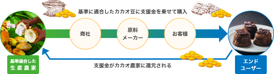 不二製油株式会社では持続可能なカカオ豆生産に向けて、その重要性を理解した上で生産地の農家への支援金を上乗せした価格で顧客が商品を購入できる「サステナブル・オリジン」という取り組みを行っています。この取り組みの対象となるのはサステナブルな基準に適合したカカオ豆となりますが、基準品と非基準品が混在するマスバランス方式の考え方が採用されています。