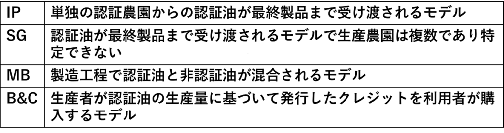 また、マスバランス方式は持続可能な調達を達成するために最も適切とされている手法ではなく、特定の仕入れ先から100%再生可能・認証原料由来を調達するアイデンティティ・プリザーブド(IP)という手法が理想的であるとされています。RSPO認証は、IPを含めた3つのサプライチェーンモデルと1つの証券化モデルを認証しています。サプライチェーンモデルはIPの他にセグリゲーション(SG)とマスバランス(MB)があり、証券化モデルとしてブックアンドクレーム(B&C)というモデルがあります。実質的には非認証油を使用するB&Cや非認証油を一部使用するマスバランスは、将来的には認証油のみの取引に移行していくことを前提とした仕組みと位置づけられているといえるでしょう。