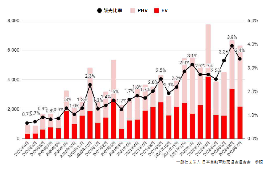 実は2022年は国内のEVシフト元年とも言われています。国内でもEVの新車登録台数が伸びてきていまして、2022年6月にはEV・PHVの新車販売は7,000台弱となり、新車販売におけるEV・PHVの比率が3.9%と過去最大となりました(軽自動車を除く)。2020年4月の比率が0.7%でしたから、この2年間を見ても一気に跳ね上がっていますね。