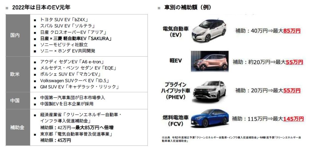 なるほど、国内でも普及しそうですね。一つ気になるのが、何故2022年の今、ここまで伸びてきているんでしょうか。これまでも国内で車の販売は行われていますよね。