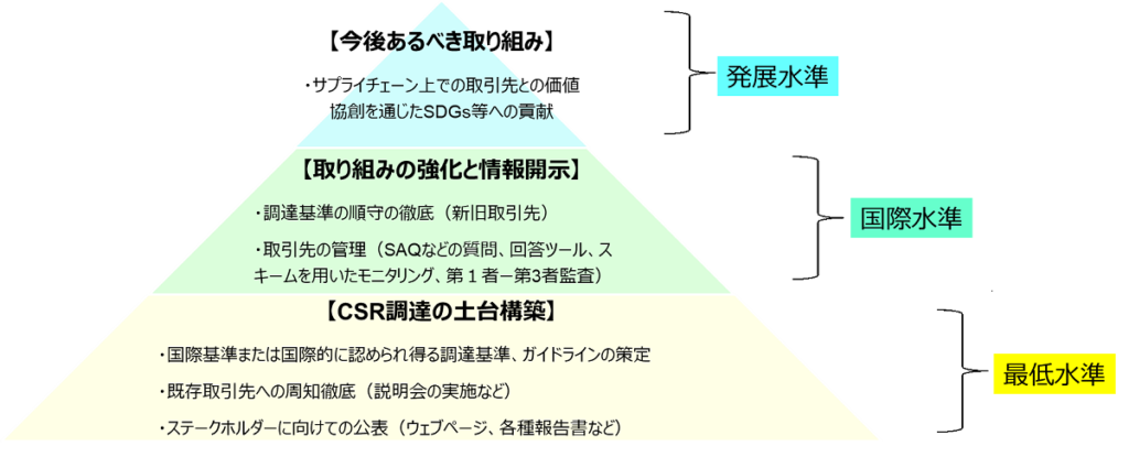 ESG経営の観点においては、今後も投資家やNGO等からのリスクに関する情報開示要請が強まると考えられます。調達にかかる欧米各国の法規制も進んでいるため、今後、イニシアチブによる調達基準の強化や透明性が高い自社あるいは第三者監査の実施(ソフトロー)も、促進されるでしょう。