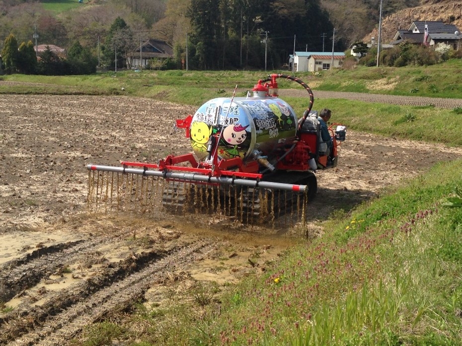 ▼バイオガスプラントからの液肥の散布作業(宮城県南三陸町)