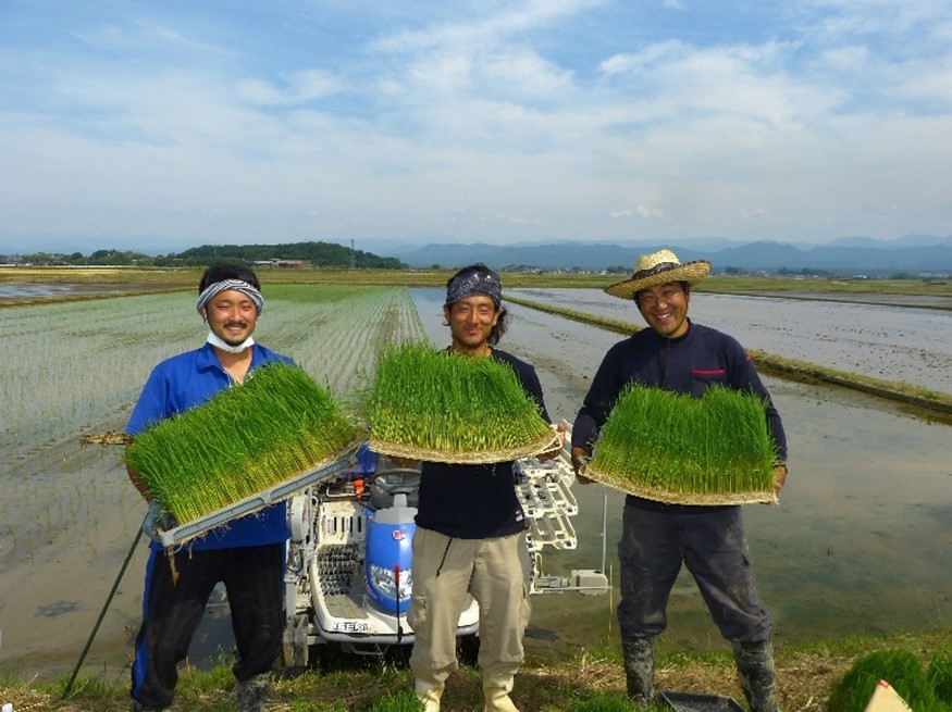 ▼アミタの育苗技術指導による大きな成苗と若手農家たち(石川県加賀市)