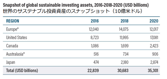 ひとつは投資家によるESG市場への投資額が年々拡大しているということです。GSIAは2年に1回世界のESG投資額を公表しています。2021年7月に公表されたデータによれば、2020年のESG投資額は35.3兆ドル(約3,900兆円)でした。地域別で見ると日本は2018年の約2.2兆ドルから32%増の約2.9兆ドルです。