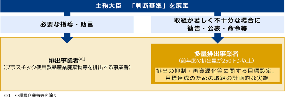 本法律では、プラスチック使用製品産業廃棄物等を排出する事業者(事務所、工場、店舗など事業を行う多くの事業者)に対して、積極的な排出抑制と再資源化等を求めています。