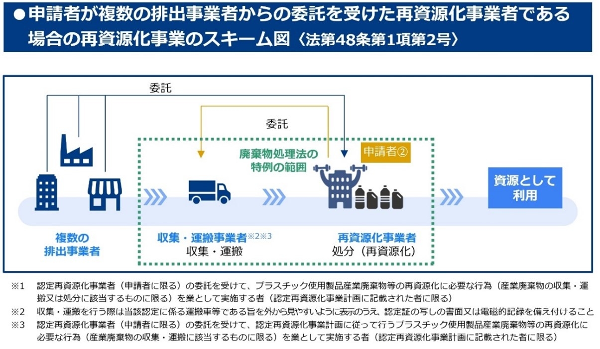 複数の排出事業者からの委託を受け、排出されたプラスチック使用製品産業廃棄物等の再資源化を行う再資源化事業者