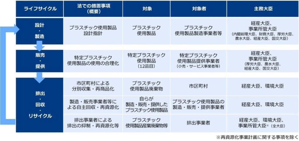 2022年4月に施行されたプラスチック資源循環促進法は、プラスチック使用製品の設計・製造、販売・提供、排出・回収・リサイクルのライフサイクル全般において、あらゆる主体によるリデュース、リユース、リサイクルその他の再生を促進するための法律です。本法律では製造事業者、ワンウェイプラスチック提供者、自治体、販売事業者や排出事業者など、プラスチック使用製品のライフサイクルに係る主体毎に要求事項が定められています。