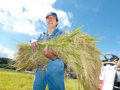 有機農法で復活させ、収穫を喜ぶ農家(宮城県南三陸町)
