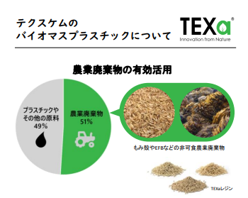 しかし一番大きな課題が膨大な農業廃棄物なんですね。TEXaは、この農業廃棄物を有用資源化するものです。開発に10年かけ、相当の予算をつぎ込んでいるんですよ。51%がバイオベース素材で、加工性状は従来のプラスチックと同じものです。そうすると(各地で規制が進みつつある)プラスチックの扱いではなくなるんですよ。これは非常に大きなイノベーションになると期待しています。