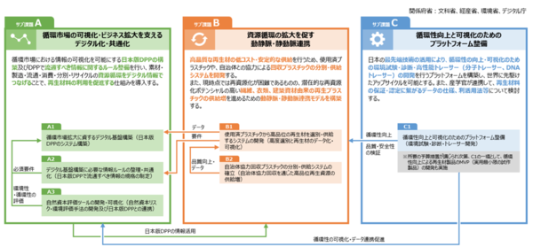 この認識に基づき、内閣府が主導する戦略的イノベーション創造プログラム(SIP:Cross-ministerial Strategic Innovation Promotion Program)のサーキュラーエコノミーをテーマとしたプロジェクトの中では、循環性向上と可視化のためのプラットフォームの整備、国内外の再生材データバンクの構築と利活用検討、特に自動車に適用可能な高品質な再生について検討が進められています(サブ課題C) 。また並行して、高品質な再生材の低コスト化・安定的な供給を行うため、使用済プラスチックや自治体との協力による回収プラスチックの分別・供給システムの検討も進められており(サブ課題B)、産官学が連携し、市民を巻き込んだ循環モデルが徐々に描かれつつあります。