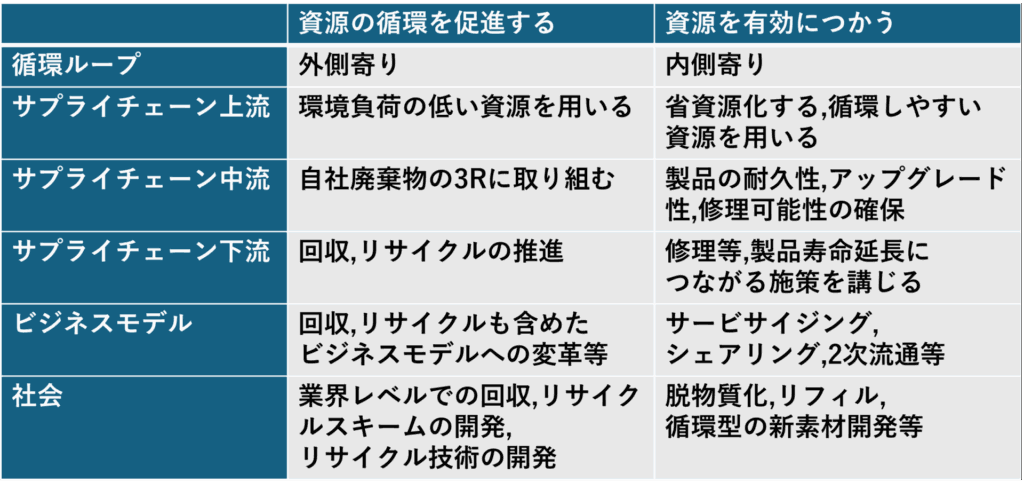 このようにビジネスにおけるサーキュラーエコノミー化の切り口は多数存在し、前述したバタフライ・ダイアグラムにおける複数の循環ループでモデル化されています。外側のループは、これ以上再利用できないものをリサイクルすることであり、従来の3Rの考え方の延長線上にあります。内側のループはサプライチェーンの上流・下流と、それを取り巻くビジネスモデルや社会にも注目したものであり、サーキュラーエコノミーで特に重要視される部分です。内側のループでは、製品の耐久性を向上したり、修理や再充填を可能にする設計や仕組みを作ったりすることで、資源を効率的に利用し、製品ライフサイクルの複数の場面で、顧客接点と収益機会を作り出すことも可能です。