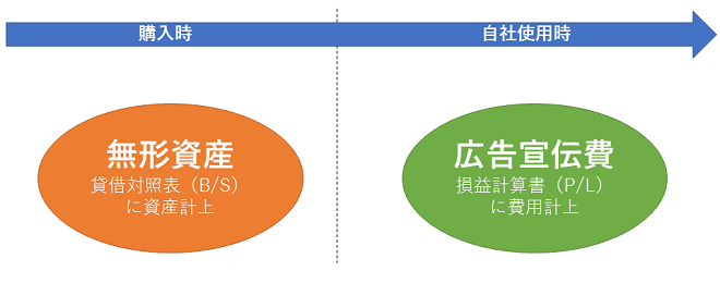 | 自社使用時 (無効化時) | 「広告宣伝費」等の科目で処理 | (借方)広告宣伝費100万円/ (貸方)無形資産100万円 |