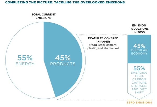 エレンマッカーサー財団の報告では、エネルギーに関連する温室効果ガスの排出量は約55%であり、残りの約45%は、製品の製造と使用に関連するものであると指摘しています。