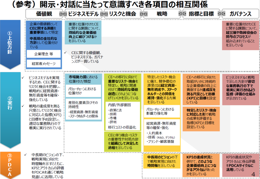 | ガバナンス | ・サーキュラーエコノミーへの移行に中長期的な視点が不可欠であることを理解し、経営層や取締役会が積極的に関与するプロセスがある ・KPIの達成状況や成果の評価を活用したPDCAが機能している |