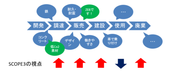 鉄やコンクリートを使用し、耐久・耐震を満たした建物を建設し、その後の廃棄はユーザー、解体業者次第となっています。そして、昨今では上記のサプライチェーンのある一部分にのみESG視点を取り入れた動きがあります。例えば、CO2排出量が低いコンクリートを使用すること、消費するエネルギーの収支をゼロにすることを目指した建物(ZEB)を建設することなどが挙げられます。しかし、このような部分的な対応ですとサプライチェーン全体でのCO2削減達成は難しくなります。