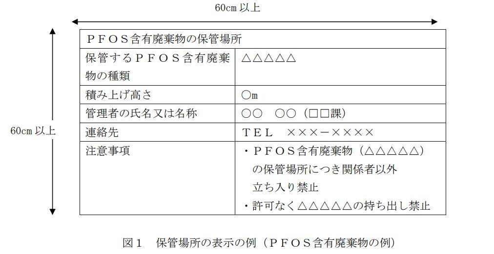 また「PFOS・PFOAの含有廃棄物の保管場所である旨を表示する」際の掲示板については、下記のような表示例が掲げられています。
