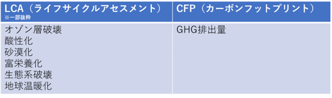 カーボンフットプリントと似ているものにライフサイクルアセスメント(Life Cycle Assessment、以下LCA)というものがあります。LCAとは商品やサービスのライフサイクル全体で、あらゆる活動による環境影響を定量的に計算・評価するものです。ここまでの説明だとカーボンフットプリントとの違いが分かりにくいですが、LCAとカーボンフットプリントの違いはGHG算定時の評価対象にあります。カーボンフットプリントはLCA手法をベースにしていますが、GHGが気候変動に与える影響のみを評価対象としています。
