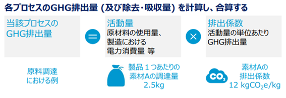 カーボンフットプリントは算定範囲となるライフサイクルにわたって、対象となる活動量を分析し、その活動から生じたGHG排出量を計算します。計算の際のデータは原則として、全て自社で取得した1次データを収集する必要があり、1次データの収集が難しい場合も可能な限り客観性と正確性の高いデータを使用することが求められます。