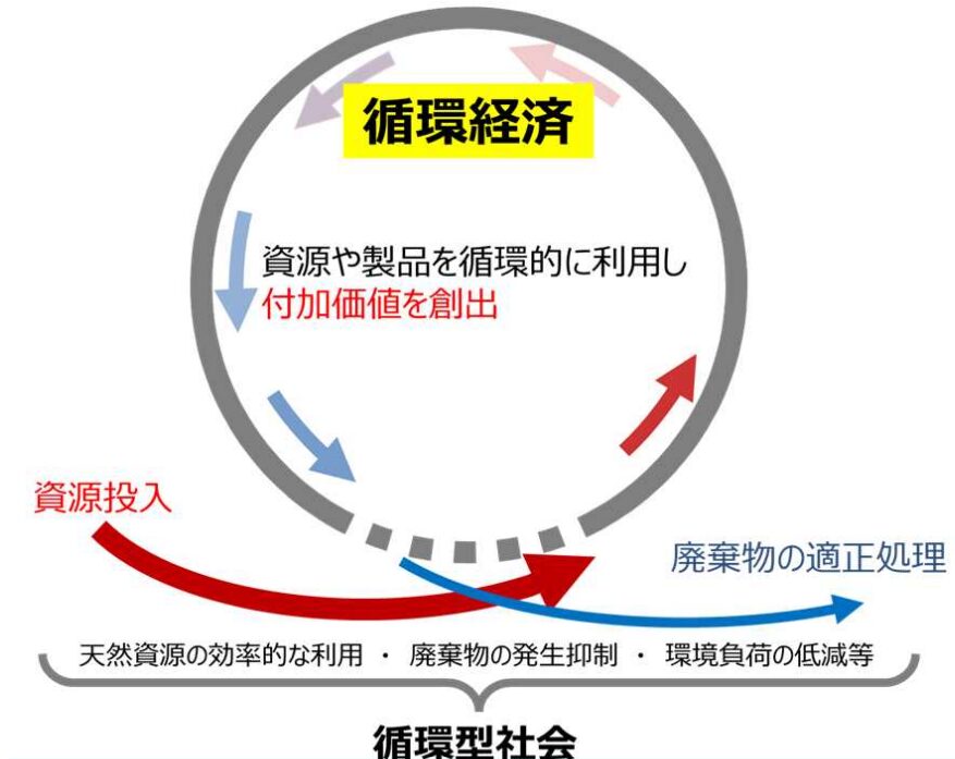 この法律が施行された背景には、第五次循環型社会形成推進基本計画の策定を始めとした、サーキュラーエコノミー推進に向けた取り組みがあります。第五次循環型社会形成推進基本計画とは「循環経済」への移行を国家戦略として明確に位置付け、気候変動、生物多様性の損失、環境汚染等の社会的課題を解決し、産業競争力の強化、地方創生、経済安全保障に資する、循環型社会の形成に関する施策の総合的かつ計画的な推進を図るために策定されたものです。
