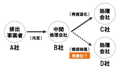 具体的には「汚泥の脱水を委託された業者が、脱水後の「脱水汚泥」を、別の焼却業者に焼却を委託する」という行為です。