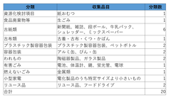 今回は20分類で回収を行いました。内訳は生駒市の既存分別および地元で集団資源回収品として集めている資源に加えて、可燃ごみの中から生ごみと紙おむつを資源化調査のために新たに分類して回収、さらにリユース品とフードドライブについても回収しました。