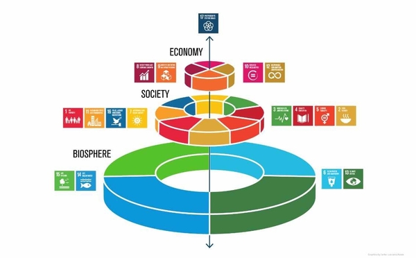 例えば2016年にスウェーデンのストックホルムにあるレジリエンス・センターのヨハン ロックストローム氏らによって提唱された「SDGsウェディングケーキモデル」では、生物多様性が生み出す生態系サービスとSDGsの位置付けを表わしています。