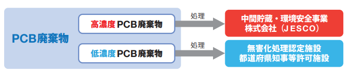 PCB廃棄物は、PCB濃度により高濃度PCB廃棄物と低濃度PCB廃棄物に分類されます。