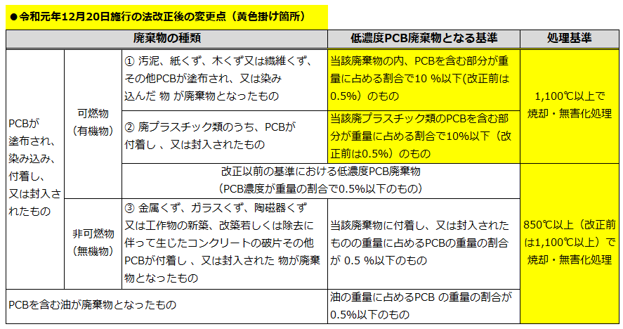 改正ポイント1:従来の高濃度PCB廃棄物の一部が、低濃度PCBとして処理可能に