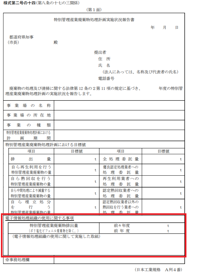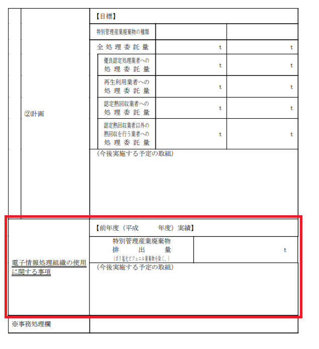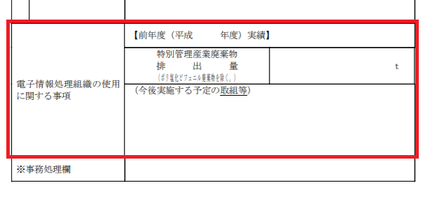 「電子情報処理組織の使用に関する事項」の欄には、前々年度及び前年度における特別管理産業廃棄物の排出量(ポリ塩化ビフェニル廃棄物(令第2条の4第5号イからハまでに掲げるものをいう。)を除く。)並びに電子情報処理組織使用義務者にあっては前年度に実施した電子情報処理組織の使用に関する取組(情報処理センターへの登録が困難な場合として廃棄物の処理及び清掃に関する法律施行規則第8条の31の4に該当したときは、その旨及び理由を含む。)について記入すること。
