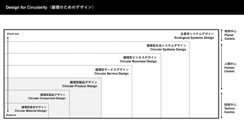 サーキュラーデザインにおいては、このように解像度高くユーザーニーズを捉える「ズームイン」の視点と、製品やサービスを取り巻くシステム全体を俯瞰する「ズームアウト」を行き来しながら、全てのレイヤーにおいて一貫性と整合性のあるデザインを行うことが重要となります。「サーキュラーデザインとは・意味」という弊社の記事でもサーキュラーデザインの概要を述べているので、参考にしていただければと思います。