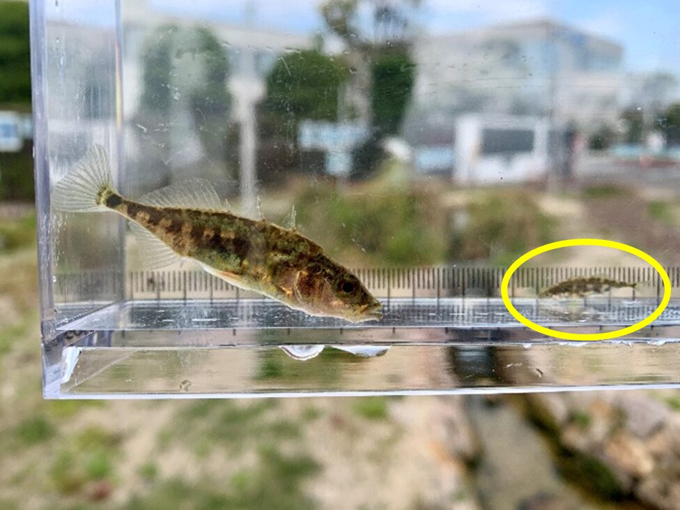 ▼ビオトープで生まれたハリヨの稚魚(黄円内)と親世代魚(左)