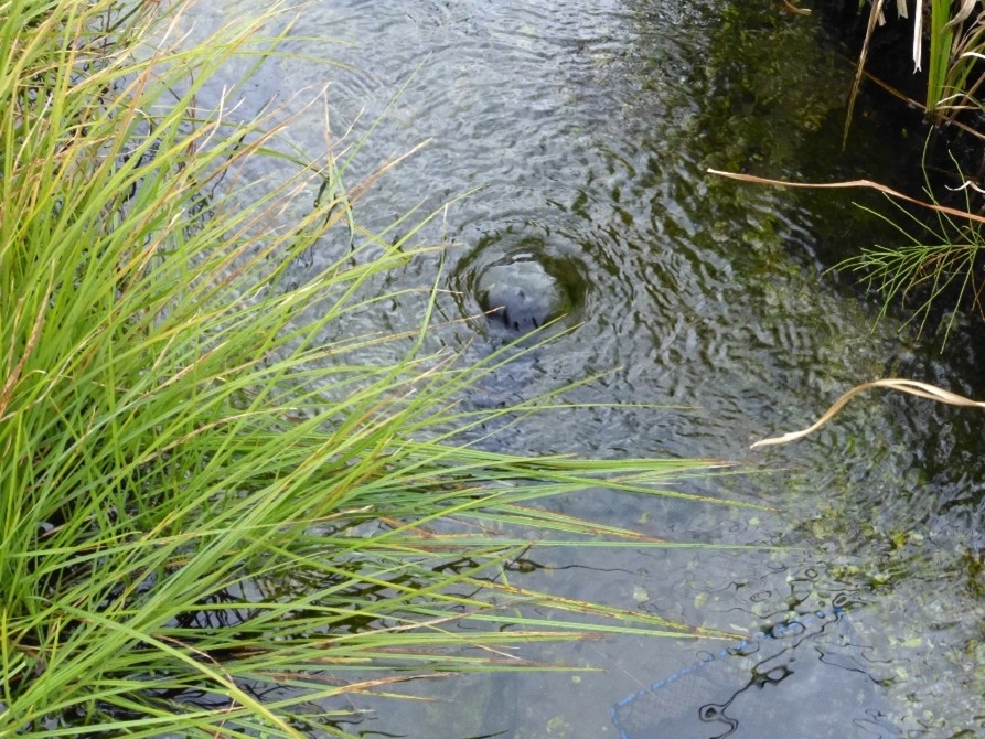 ▼汲み上げた地下水の放流口。ビオトープの水温は年間を通じて