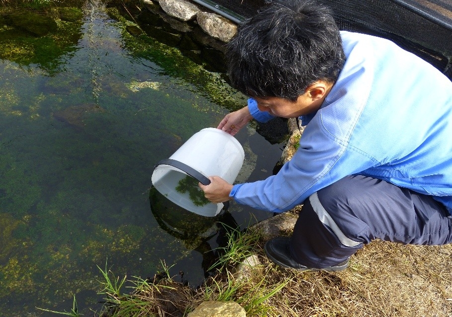「製造所内に地下水汲み上げの井戸が約30か所あり、その一部がビオトープの水源になっています。日量20トンをビオトープに放流していますが、配管に掛かる圧力の最大限界まで放流しています。今のビオトープは二代目に当たり、面積も拡大しています。以前は水温管理ではあまり苦労することはなかったのですが、最近は夏場の猛暑の影響で配管が温まり、池自体も直射日光を受けて水温が上がり気味になることがあります。するとハリヨの生息には好ましくない藻が繁茂するので、遮光して藻を抑制することもしています。あとはハリヨが巣作りをしやすいような石組みの配置なども、ビオトープの設計段階で工夫してもらっていますね。」